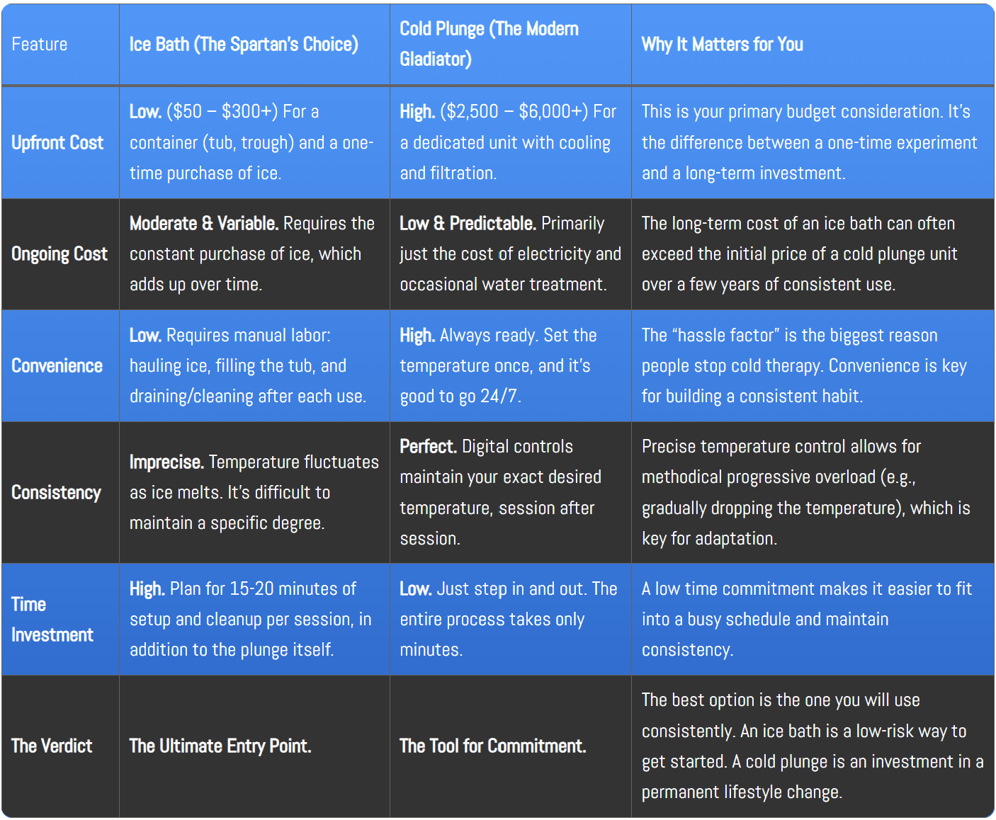 - Choose the Cold Plunge if: You are serious about making cold exposure a permanent pillar of your health protocol, you value convenience and time above all else, you have the dedicated space and electrical setup, and the upfront investment is justified by the promise of daily use for years to come. It is a tool for commitment.