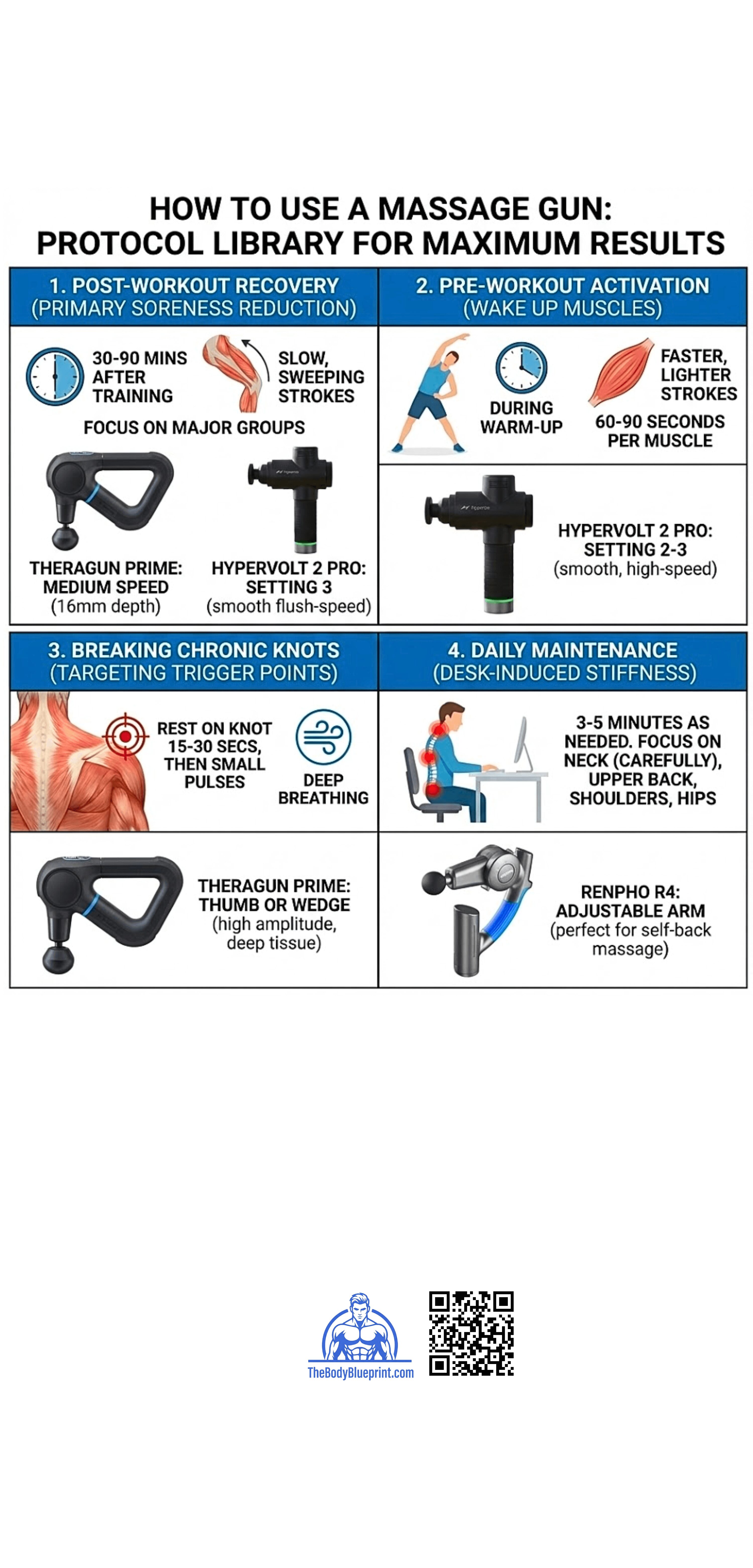 During warm-up, after dynamic movement. 60-90 seconds per muscle. Faster, lighter strokes. | Hypervolt 2 Pro excels here. Use setting 2-3. Avoid deep pressure. |